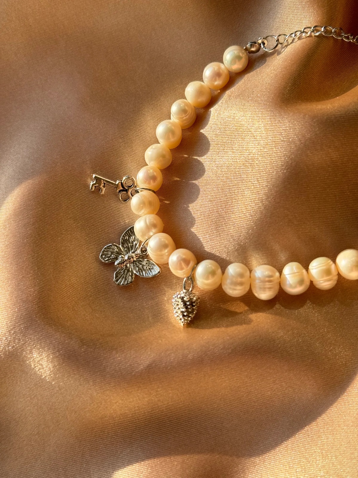 Altın zincir üzerine inci ve kelebek detayları bulunan şık bileklik. Zarif ve dikkat çekici bir tasarım.