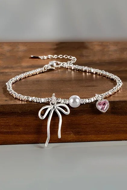 Gümüş malzemeden üretilmiş, kurdele ve kalp detaylı şık bileklik. Romantik bir tasarım sunar.