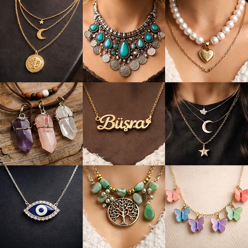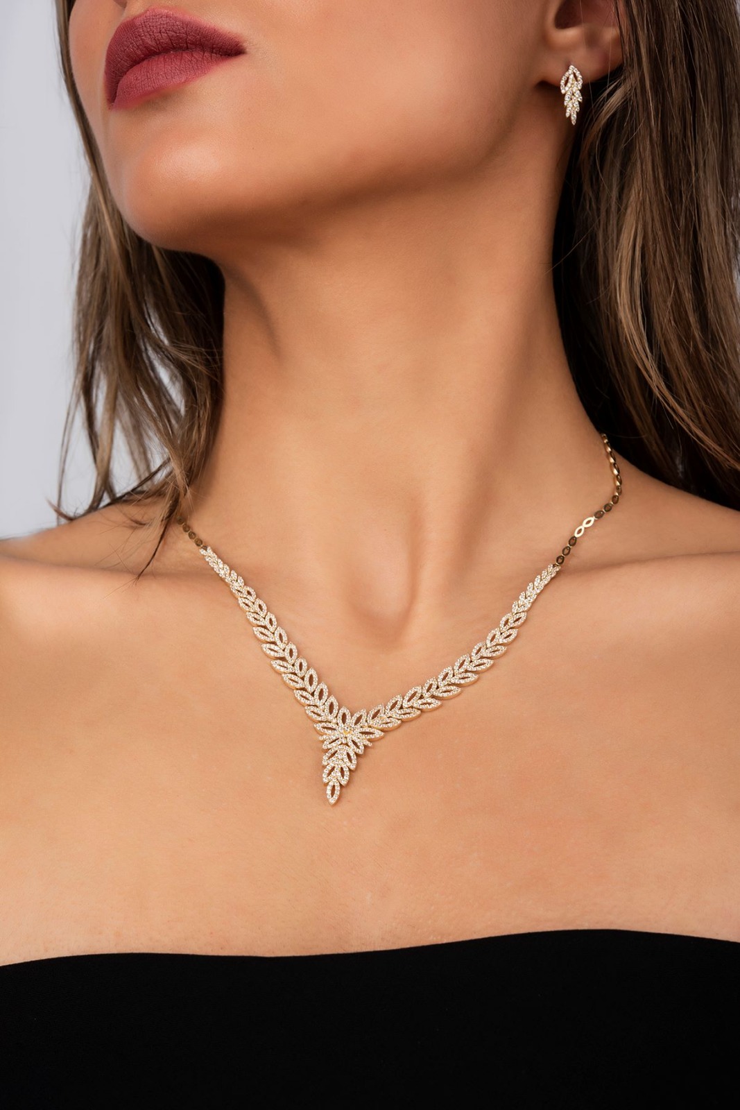 Ortasında parlak taş detayları bulunan zarif kolye modeli. Özel gün kombinleri için ideal.