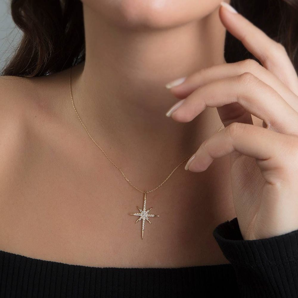 İnce zincir üzerine yıldız formunda taşlı kolye. Minimal ve modern bir görünüm sunar.